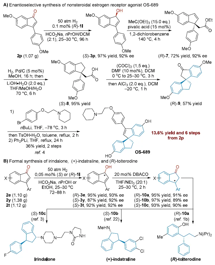 雌激素受体调节剂OS-689,之前只能通过手性HPLC拆分消旋体来制备,作者使用该方法,经过6步首次实现了对映选择性合成。另外,通过对手性茚醇产物的转化,作者合成了一系列手性茚酮产物(R)-10a、(S)-10b以及 (S)-10c,这些是药物(R)-托特罗定、(+)-茚达曲林和尹林达隆的关键中间体,充分展示了该方法良好的应用潜力。