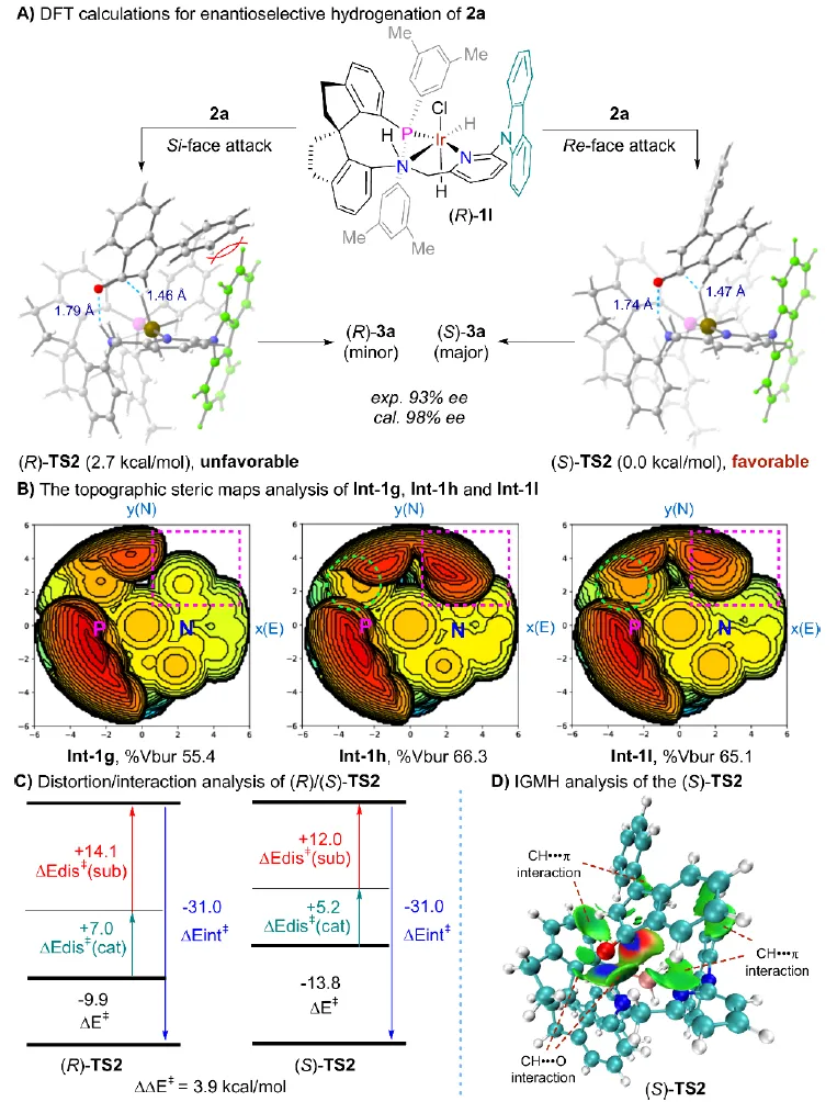 反应的DFT研究、催化剂 (R)-1l、(R)-1g和(R)-1h的拓扑立体效应图分析及(R)-TS2和(S)-TS2过渡态的畸变-相互作用分析结果表明,6-咔唑修饰的Ir-SpiroPAP催化剂(R)-1l,在反应中创造了一个紧密的手性口袋,主要利用空间位阻诱导底物产生不同的几何畸变,从而高效地区分两个对映面,实现高对映选择性。