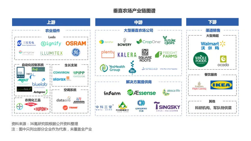 垂直农场产业链上游为农业科技组件制造商,中游为大型垂直农场公司和解决方案提供商,下游为农产品渠道销售。
