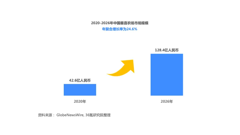 根据GlobeNewsWire数据,2020年中国垂直农场市场规模为42.6亿人民币,预计到2026年将增长至128.4亿人民币,年复合增长率为24.6%。中国市场规模的显著增长主要得益于消费者对安全优质绿色食品需求的提高、垂直农场多项技术的进步以及食品安全意识增强等。此外,中国垂直农场市场规模的增长还将受到城市化进程加快、耕地面积缩小等进一步影响。