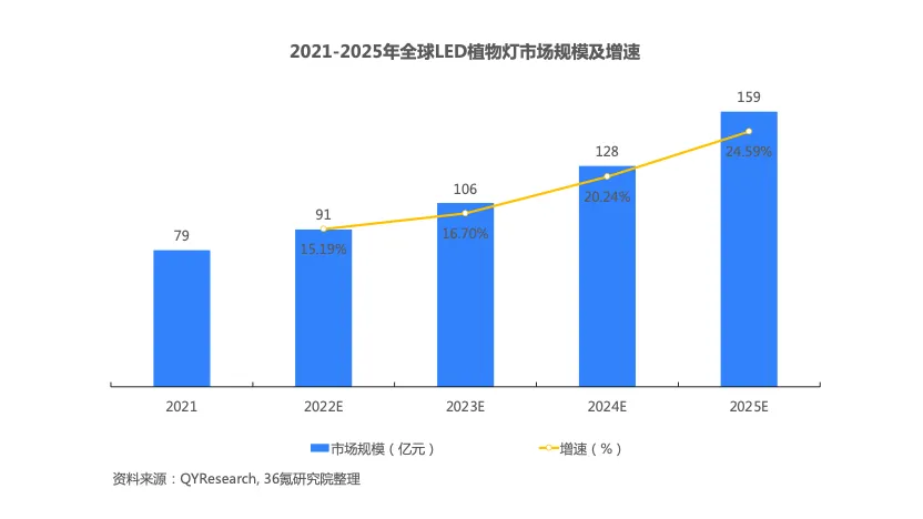 目前,LED照明灯、精准种植技术、云计算等已经应用到垂直农场发展中,以人工控制的方式来应对自然环境的不利影响,实现端到端的精细化运作,降低外部环境影响和对农药的依赖,提升土地、化肥和水的利用率。为进一步提高数据种植的高效性,突破环境限制,以LED照明技术为代表的相关技术将实现不断创新,大数据在优化种植方案方面重点发力,人工智能则在监测植物生长周期,调节光线、温度、水流等环节发挥重要作用。2021年全球LED植物灯市场规模大约为79亿元,预计2025年将达到159亿元,年复合增长率为19%。