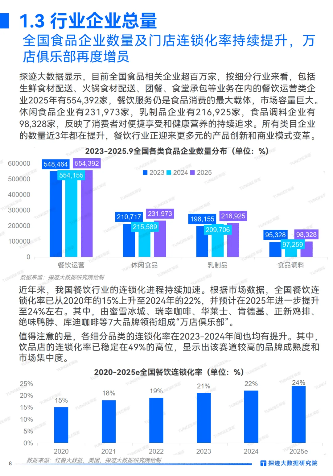 行业规模与结构上,食品工业营收超9万亿元,全产业链技术驱动特征显著。上游农业规模化、科技化,中游加工向高附加值升级,下游依托AI重构销售模式。但餐饮市场增长疲软,2025年1-5月全国餐饮收入同比增5.0%,限额以上餐企增速连续8个月低于社零总额,利润收窄使降本增效成普遍诉求。企业总量方面,全国食品相关企业超百万家,餐饮运营类企业55.4万余家,餐饮连锁化率从2020年15%升至2024年22%,2025年预计达24%,“万店俱乐部”成员扩容。地区分布上,广东餐饮门店数、新开店铺数全国最多,贵州门店增速67.14%领跑,中西部及下沉市场成增长重点。