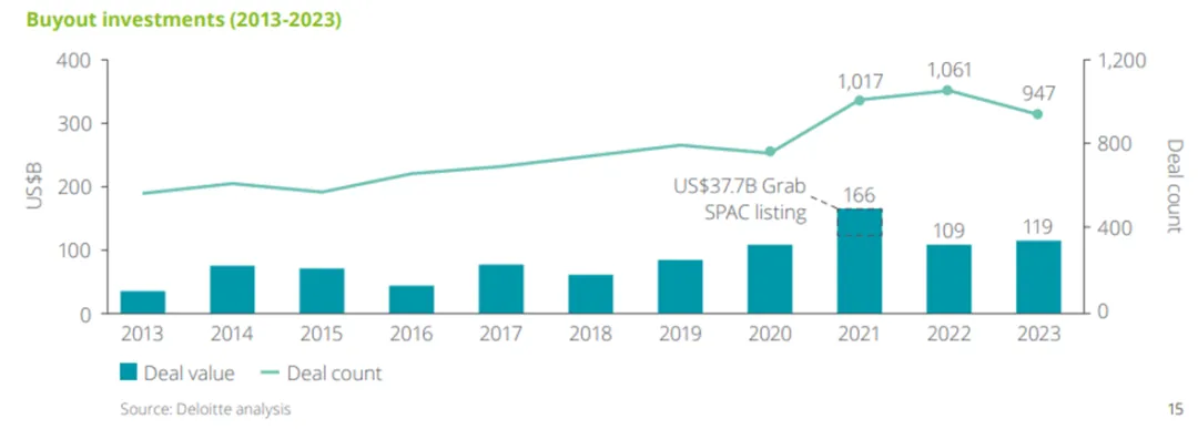 2023年对私募股权投资行业来说是充满挑战的一年:市场情绪低迷,成功交易的数量和交易活跃度均较以往有异常明显的降低幅度,其中亚太地区的并购交易的数量从2022年的1,061笔交易下降到2023年的947笔;交易执行周期拉长;退出依然面临挑战,退出金额由2022年的630亿美元下降至2023年的600亿美元。尽管如此,2023年的交易金额(1,190亿美元)较2022年(1,090亿美元)基本维持在同一水平,其中大部分交易为对被投企业的投后管理。