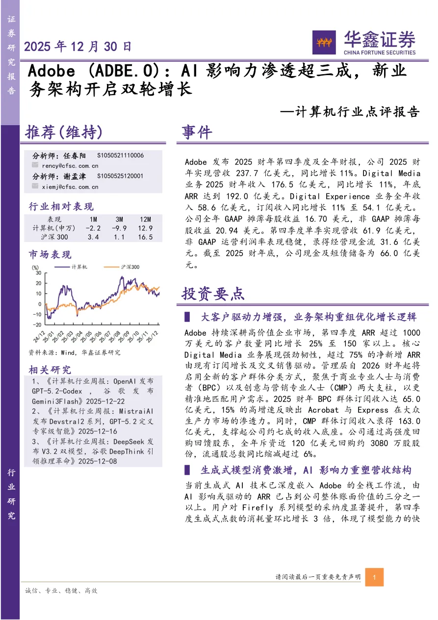 - 2026财年起将客户分为商业专业人士与消费者(BPC)、创意与营销专业人士(CMP)两类;2025财年BPC订阅收入65.0亿美元(增速15%),CMP订阅收入163.0亿美元(占公司七成收入)。