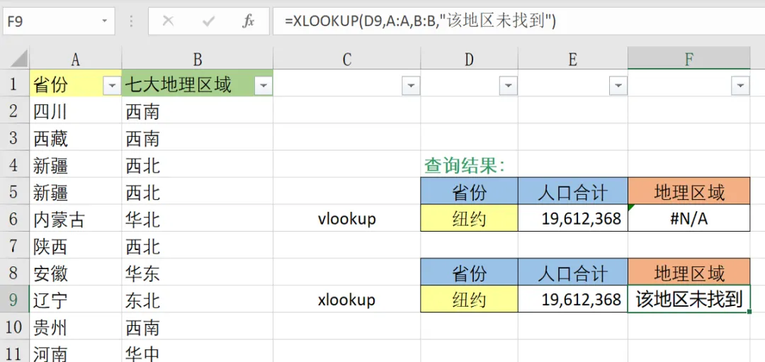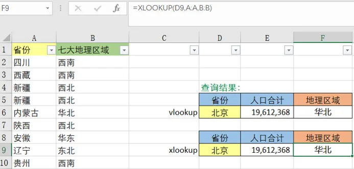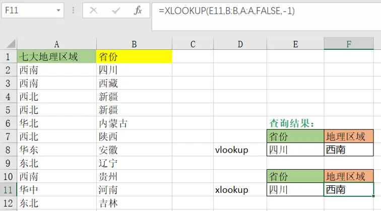 可见,全国家庭户各省的性别比整体比较均衡,而集体户男性普遍多于女性。在本例中,等效的 VLOOKUP 公式需要嵌套if{1,0}的函数,上海家庭户的男性人数对应的K4单元格公式可写为:=VLOOKUP(I4&J4,IF({1,0},A:A&B:B,D:D),2,FALSE)目标:通过已知的各省人口数,计算七大地理区域人口占比(同示例1)。同样需要将省份匹配上对应的地理区域,假设返回值(地理区域)出现在查询值(省份)前一列,即需要反向搜索时,单纯使用VLOOKUP函数就难以实现。XLOOKUP支持搜索区域lookup_array 列位于返回区域 return_array 列的右侧,即从右向左查询,而 VLOOKUP 只能从左到右。图例XLOOKUP查找值为四川(E11),lookup_array查询区间此时在范围 B:B,return_array返回区域在左侧A:A。它需要介入 search_mode 参数并选择-1执行反向搜索。