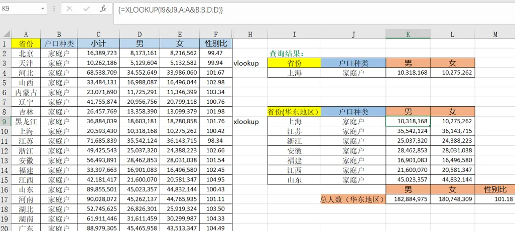 在本例中,等效的 VLOOKUP 公式是:=VLOOKUP(D6,A:B,2,FALSE)目标:通过已知的各省男女人数,分别计算华东地区各省的家庭户和整个地区家庭户的性别比。在这里,查询条件需要同时满足省份和家庭户两个条件。