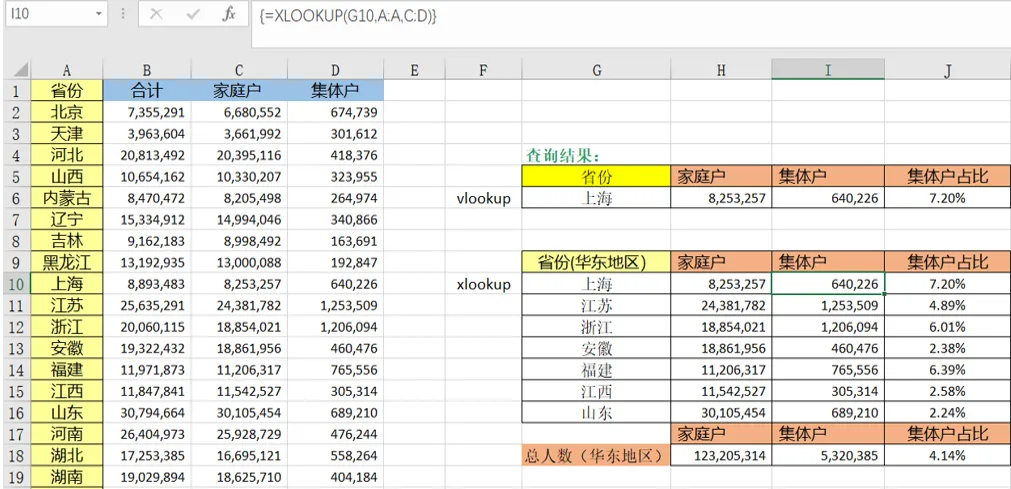搜索模式,search_mode有四个参数可选,其中:-2,表示在查询区域为降序的前提下搜索。如果未排序, 将返回无效的结果。这里,同样可以用if嵌套的方法使用VLOOPUP,公式为:=VLOOKUP(E8,IF({1,0},B:B,A:A),2,FALSE)目标:根据各省家庭户和集体户数量,计算各地理区域集体户占总人口数的比例。 与 VLOOKUP 不同,XLOOKUP 可以返回具有多个项的数组,这允许单个公式从单元格 C:D 同时返回家庭户和集体户两组数据。当输入H10单元格公式=XLOOKUP(G10,A:A,C:D)时,返回区域为C:D列,I10单元格的公式将自动补齐,补齐的I10公式也为=XLOOKUP(G10,A:A,C:D)。
