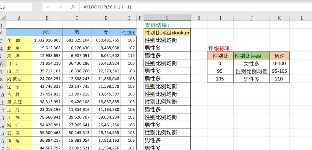 日常生活中,我们也可以通过VLOOKUP逐个列输入返回索引号的方法,分别统计家庭户和集体户,但当所需匹配的返回数组数量多时,逐个键入就显得麻烦。目标:通过给各省性别比评级,找到男女比例差异较大的省份。我们给性别比评级分为三档:男性多、性别比例均衡、女性多。本示例通过查找各省性别比在I列上的区间范围所属,返回对应的J列数据,如河北省性别比为102.84,介于95-105之间,则应匹配I列95档的评级内容,返回河北“性别比例均衡”。此示例中,性别比查询区间为顺序,查询需返回下一个较小的项95,故match_mode输入-1。同时,XLOOKUP也可以进行倒序匹配,公式不变。通过性别比评级的划分,发现大部分省份男性比例较高(19个省份),其余较为均衡(13个省份)。其中,天津省的性别比最高114.52,江苏最低101.52。