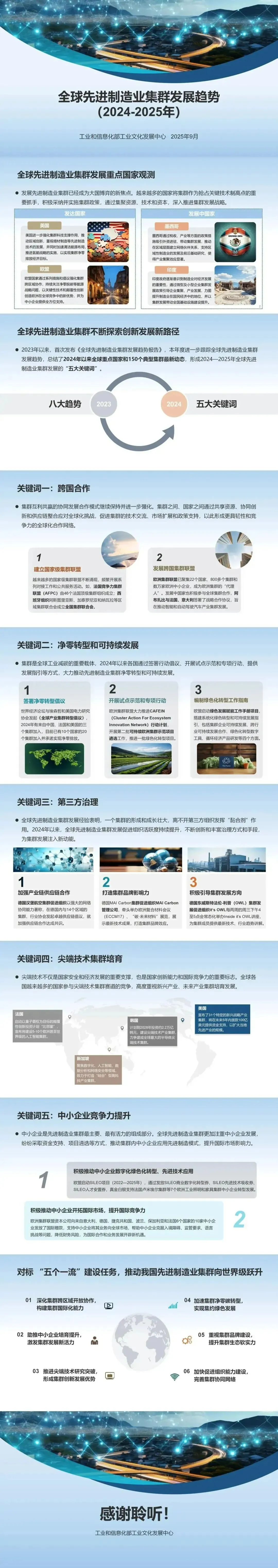 先进制造业集群是制造业高质量发展的核心趋势,也是制造强国战略布局的关键重点,对推进新型工业化、保障产业链供应链安全、构筑大国经济安全屏障具有重要意义。党中央、国务院高度重视其培育发展,习近平总书记作出系列重要指示,党的二十届三中全会也提出明确要求。在新一轮科技革命和产业变革深入演进、全球产业链供应链加速重构的背景下,课题组以全球 150 个典型集群为跟踪样本,延续往年研究基础,梳理 2024 年以来全球重点国家及集群最新动态,提炼出五大年度关键词,并形成我国集群培育提升的相关建议,为政府、相关组织及企业提供参考。