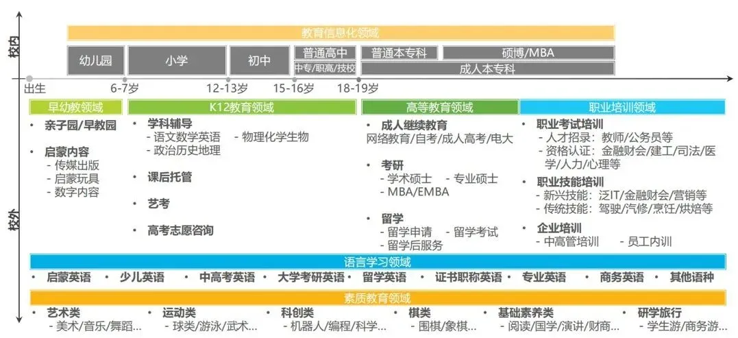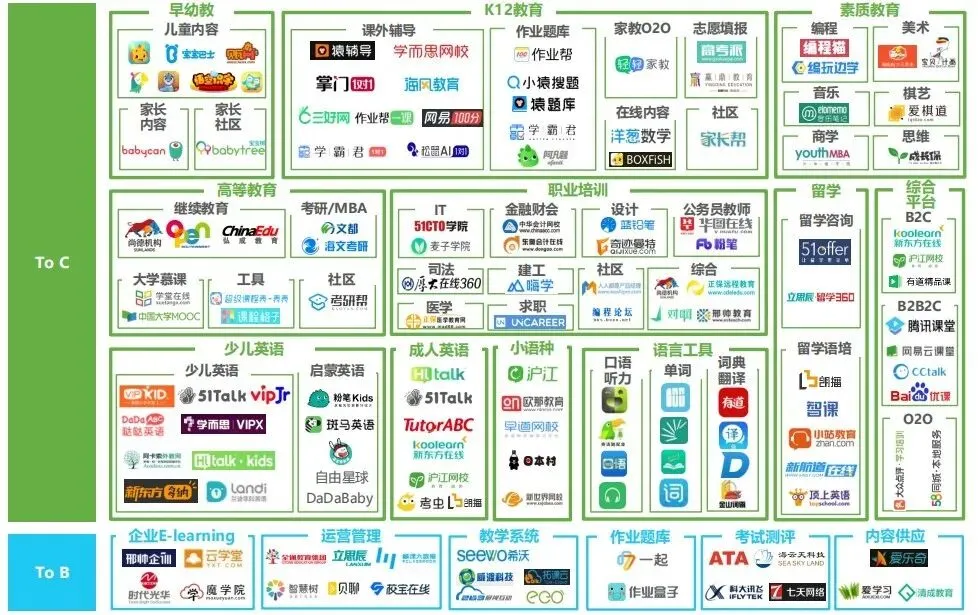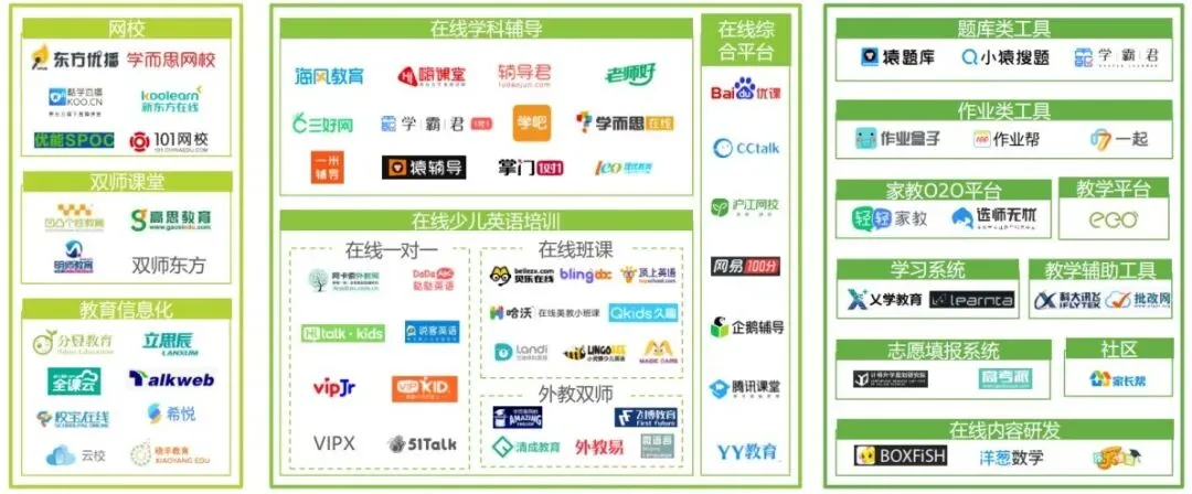 随着互联网、移动互联网在国内的快速渗透,以及网络带宽的扩容提升,2013年起,出现了一波在线教育的创业热潮,越来越多的企业面向用户提供各类精准解决用户痛点的产品,如致力于帮助用户使用手机和影视作品练习口语的英语流利说、英语趣配音,致力于帮助孩子在线练习英语口语的VIPKID、DaDa英语,致力于帮中小学生解决在线查题解题的作业帮、猿题库……在线教育行业的创业公司数量突飞猛进,并且吸引了大量的创投资金。这个时期在线教育公司的产品和服务大都能切实解决用户的痛点,受到了用户的欢迎,短期内用户数就突破了百万数量级,有些甚至短短半年内用户量就突破了千万。不过由于此时大部分在线教育产品是工具类产品,用户习惯了免费使用产品和服务,付费转化的难度非常高,创业公司在经历了短暂的用户快速增长的狂喜后开始面临变现的压力,通过各种方式探索可能的商业模式。直到2017年,多家在线教育企业殊途同归、发现在线直播课是一个可以快速规模化变现的商业模式。这个阶段是在线教育行业的模式探索期。这个阶段,随着互联网和移动互联网在新一代教育用户群体生活中渗透率的深化,在线教育几乎渗透了教育行业的各个细分领域(详见下图),并且每个细分领域都有多家企业进行竞争,为用户提供更优质的教育服务。