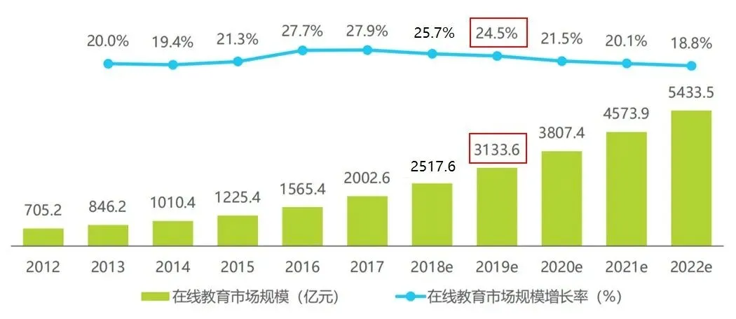 随着互联网、移动互联网在居民日常生活中的渗透,以及在线学习体验和效果的不断提升,用户对在线教育的接受度快速提升。根据艾瑞咨询数据,预计2019年中国在线教育行业用户规模将达到1.64亿人,同比增长21.1%,市场规模将达到3133亿元,同比增长24.5%。预计未来2-3年用户规模和市场规模仍将保持15%以上的快速增长。