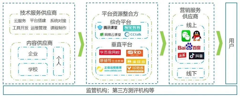 互联网巨头由于业务布局广泛,在产业链多个环节都有参与,比如腾讯、阿里和头条,不仅在上游提供云服务、工具开发服务和内容,在下游基于微信、头条、抖音等自身平台帮助平台方参与营销服务,本身也搭建了自己的在线教育平台,系统性整合市场上的教育资源面向用户提供服务,比如腾讯课堂、淘宝教育等。