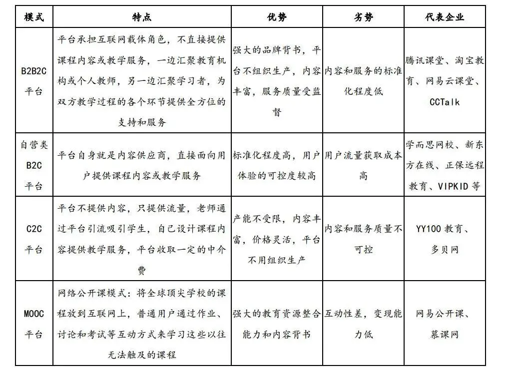 经过20多年的发展,中国在线教育行业的产品和模式不断演化,从平台经营模式来看,主要有B2B2C平台、自营类B2C平台、C2C平台、MOOC平台4种模式,4种模式的特点、优劣对比及代表企业详见表1所示。整体来看,4类平台借助各自的资源优势进行经营,各有千秋。目前在一级市场最受关注的是各种细分领域的自营类B2C平台。