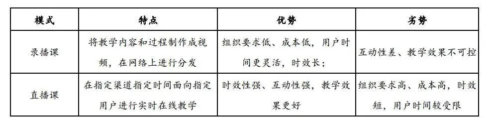 从教学的组织方式来看,主要有录播课和直播课两种模式(详见下表)。录播课是2000年就有的模式,由于其便于组织、成本低、便于用户利用碎片化时间进行学习等优势,具有顽强的生命力。2017年之前录播课一直是在线职业教育和在线高等学历教育领域的主要模式。直播课则是2017年才开始兴起的新模式,由于时效性强、互动性强、教学效果更好,受到用户的广泛欢迎,目前已成为行业主流的教学组织方式。