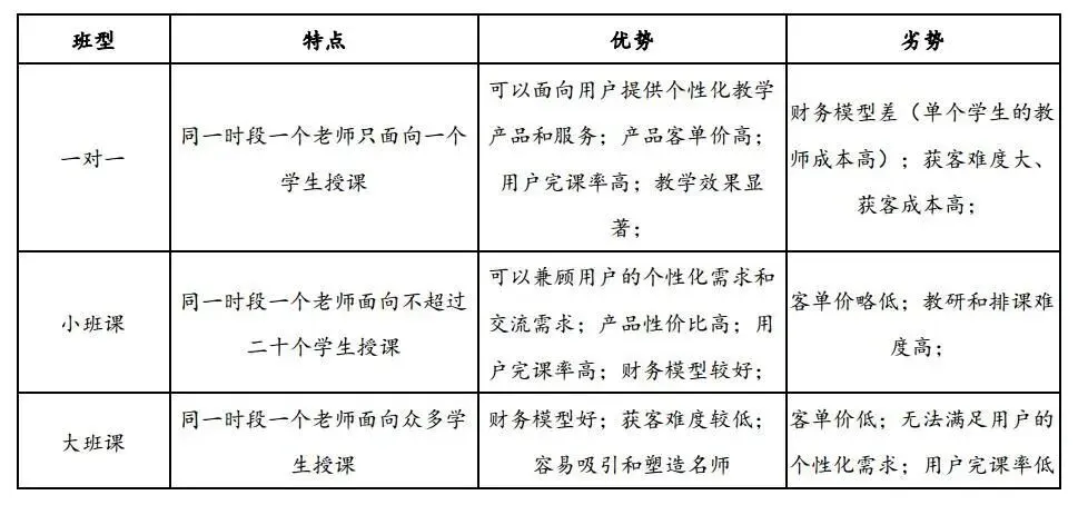 经济模型核心关注公司的成本结构和规模化生产能力。在线教育企业的经济模型一般跟企业提供教学产品和服务的班型紧密相关。一般来讲大班课由于单个老师面向大批量的学员授课,且不考虑个性化诉求,复制难度相对较低,其经济模型要优于小班课和一对一。而一对一,由于单个老师同一时间段只面向一个学生授课,且教学准备环节要充分考虑客户的个性化诉求,存在显著的规模不经济性,其经济模型是最差的。