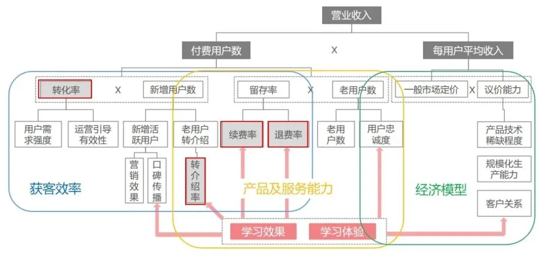 从上图可以看到,在线教育公司的获客效率、教学产品和服务能力、经济模型三者往往是紧密相关的,好的产品和服务能力有助于提升公司的获客效率,而经济模型则直接关系到教学效果以及用户/客户对产品和教学服务的体验和评价。