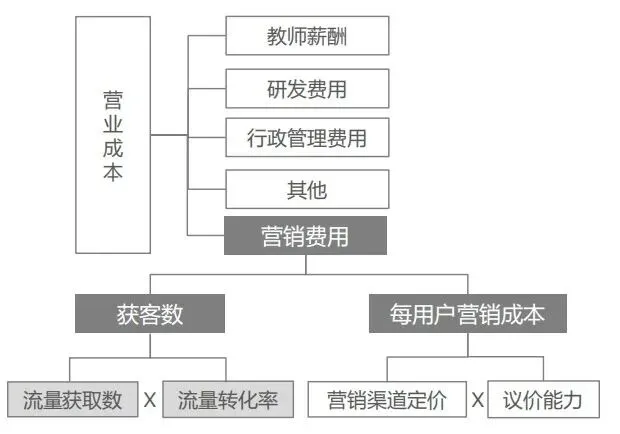 如果从营业收入、营业成本的角度对上述经营流程进行分解,可以看到在线教育企业的经营过程中有三个核心关注点:获客效率、提供产品和服务的能力以及经济模型。