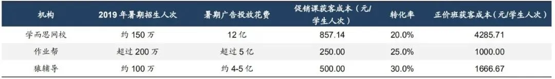 下图是经过这次市场争夺战,第一梯队的3家机构2019年暑期招生的情况,可以看到3家机构基本上都通过这场争夺战获得了百万级别的招生人次,同时也投入了巨额的营销费用烧钱来保证快速占领市场。根据36氪的数据,2019年秋季中国K12在线教育CR3的市场占有率已经超过了70%,行业集中度相比于传统的K12教育非常高,体现了K12在线教育互联网的属性。