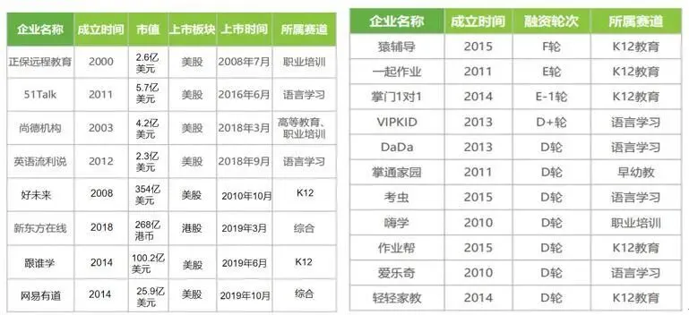 在线教育其他细分领域与K12在线教育行业类似,基本上都出现了各自领域的领先企业。如下图所示,在线教育的各个细分领域都出现了上市公司或者融资轮次已非常靠后、融资金额超过亿元美金的头部企业。在在线少儿英语、在线高等教育、在线驾考等领域都出现了主要市场份额集中在一两家头部企业的现象,市场竞争格局初步成型。