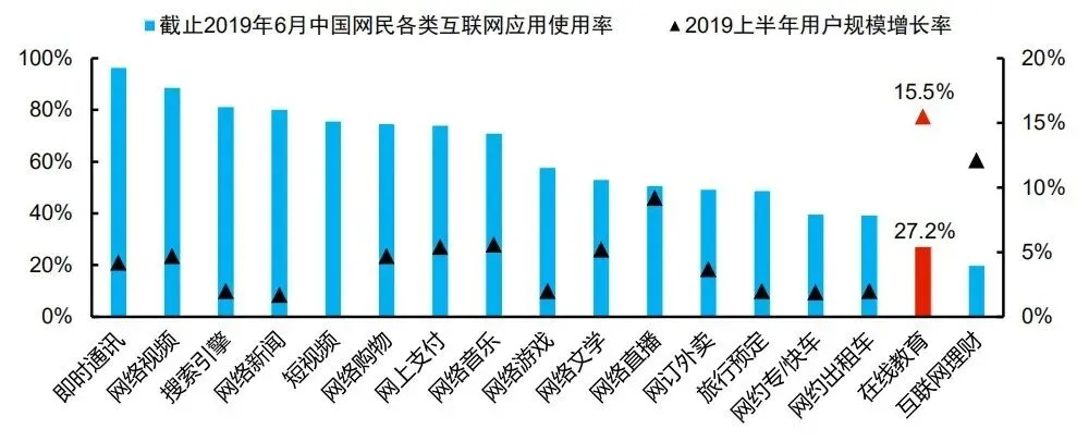 过去十年,随着移动互联网的普及和各类移动应用软件的快速发展,移动互联网快速渗透改造了一个又一个行业。根据CNNIC 发布的第 44 次《中国互联网络发展状况统计报告》,截止2019年6月,在线教育类应用跻身17类常见的互联网应用场景,并且成为其中用户规模增长最快的应用场景。受益于AR/VR、AI等技术的发展和应用,在线教育类应用将提供更加优质的用户体验和效果,在线教育应用使用率仍将继续提升,行业快速发展趋势明确。