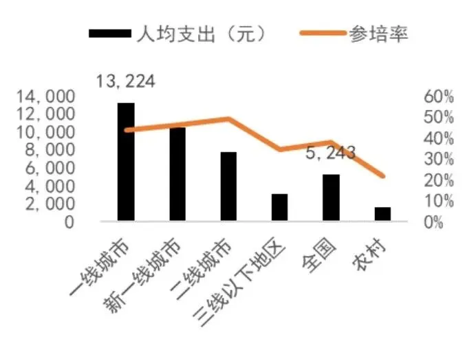 各级城市或地区K12学科类课外辅导参培率及人均支出
