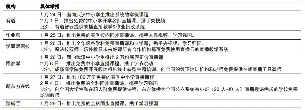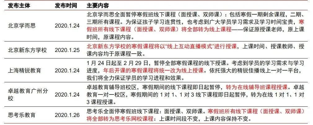 面对2020年1月突如其来的新冠肺炎疫情,政府采取了严格的疫情管控措施,各地学校推迟开学、主管部门叫停2月底前的线下教培服务活动。1月底,教育部发出了“停课不停学”的号召,无论是学校还是线下教培企业都发起了大规模的线下教学向线上教学的转移,好未来、新东方、精锐教育、卓越教育、思考乐教育等线下 K12 培训的头部机构及时地选择将寒假课程转为线上小班授课模式。在线教育机构也纷纷顺势推广,猿辅导、作业帮、学而思网校、新东方在线、有道纷纷推出免费的寒假大班直播课程。市场上掀起了一股“在线教育”热潮。