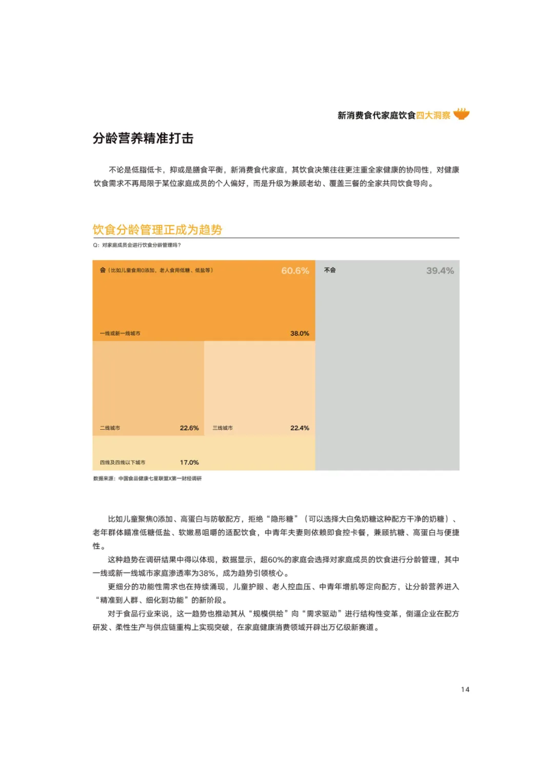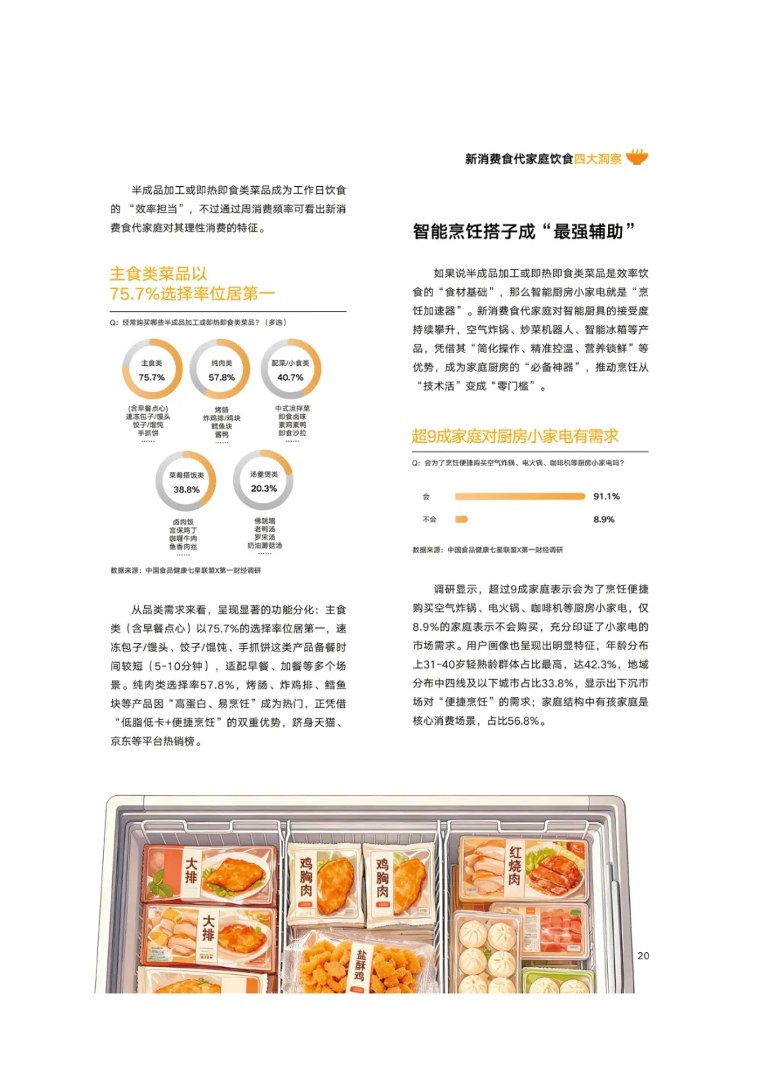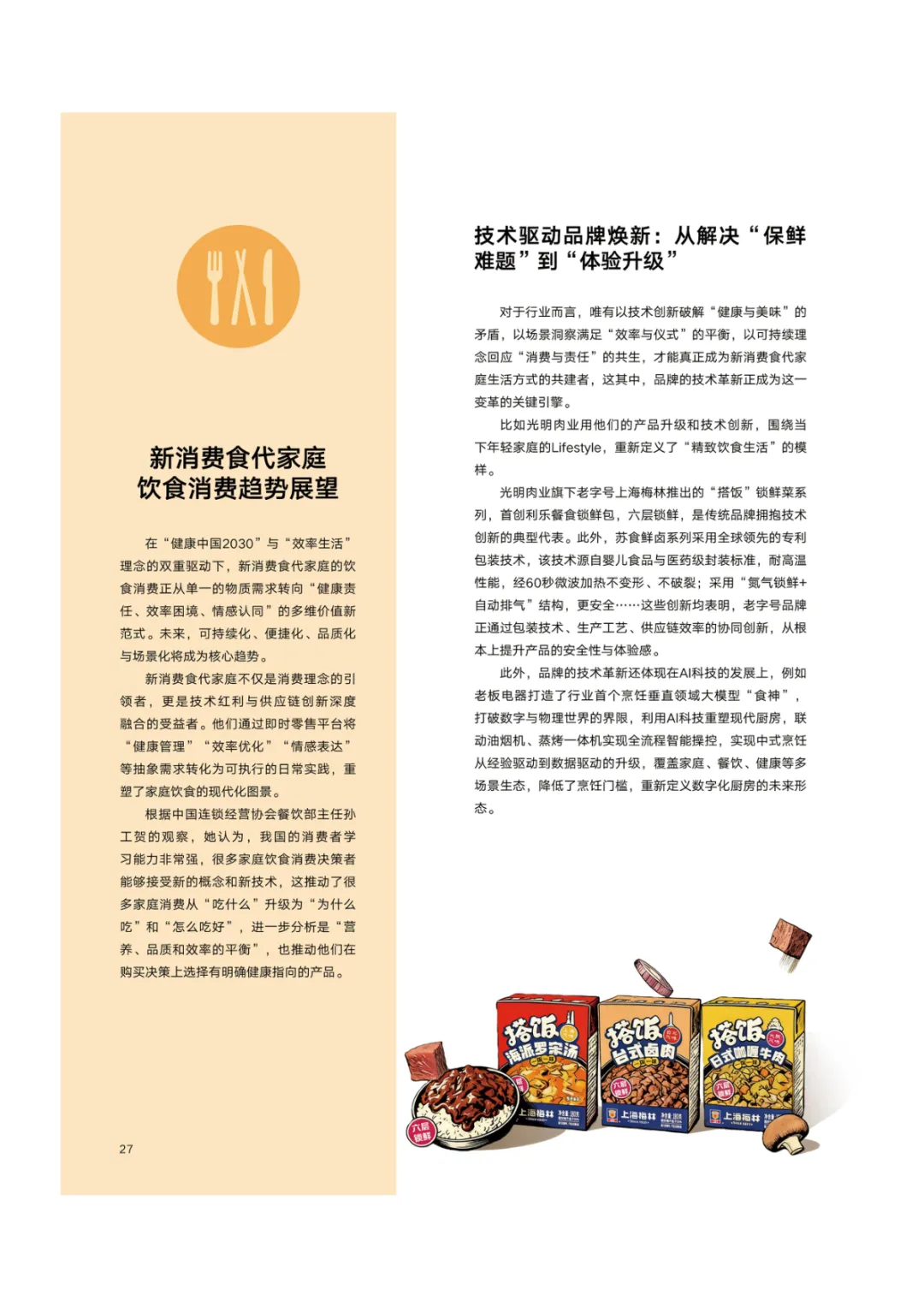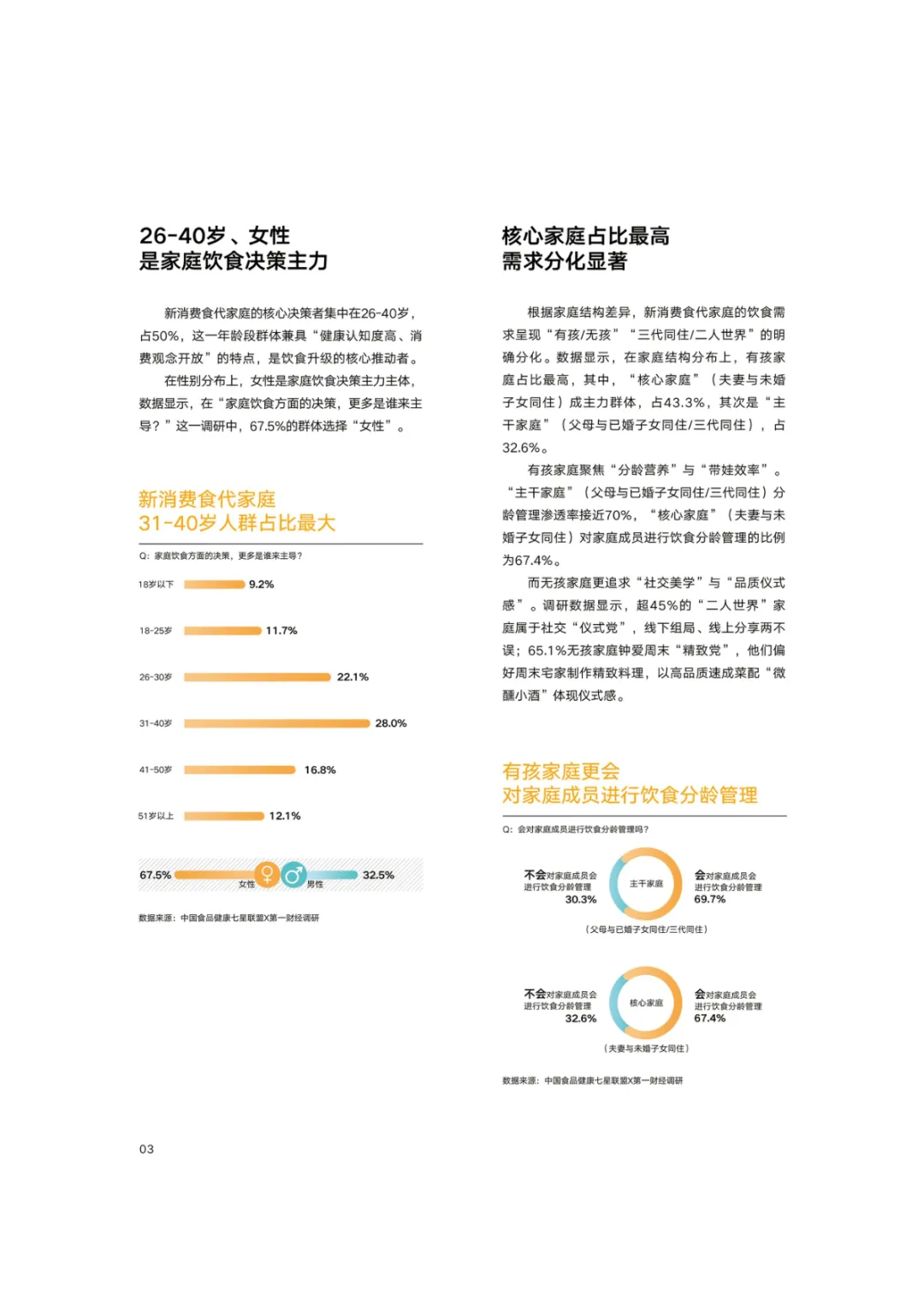 导读:报告基于 2768 份调研样本,聚焦新消费食代家庭饮食需求变革与趋势,呈现家庭饮食消费的全维度升级图景。新消费食代家庭以 80 后、90 后为核心决策群体,中高收入占比达 78.5%,覆盖一线至下沉市场。饮食需求已从单一食材升级转向 “全家适配、健康精准、效率与仪式感兼具”,分龄营养管理、成分溯源、便捷烹饪成为核心诉求。超 60% 家庭实行饮食分龄管理,82% 购买食品时优先查看配料表,近 80% 愿为可溯源成分支付溢价。效率饮食与情绪消费双线并行,半成品、智能厨具与即时零售构建 “30 分钟备餐” 生态,空气炸锅等小家电需求超 9 成。周末精致料理、户外露营饮食、家庭社交聚餐等场景化消费兴起,推动饮食成为情感传递载体。未来,技术赋能、场景细分、社交情绪价值与可持续性将成为行业核心发展方向,驱动饮食消费向多元价值共生升级。