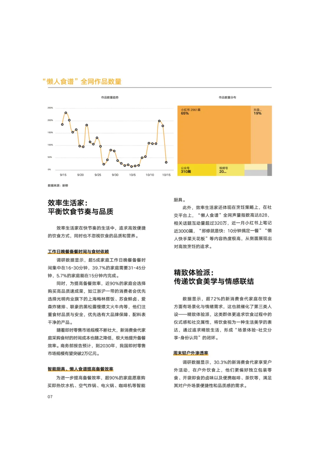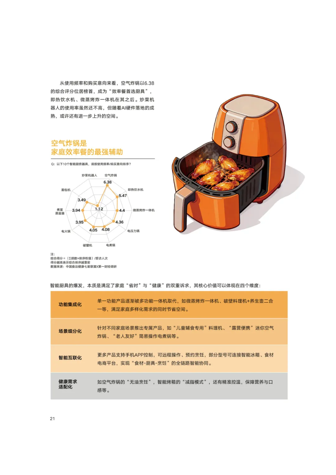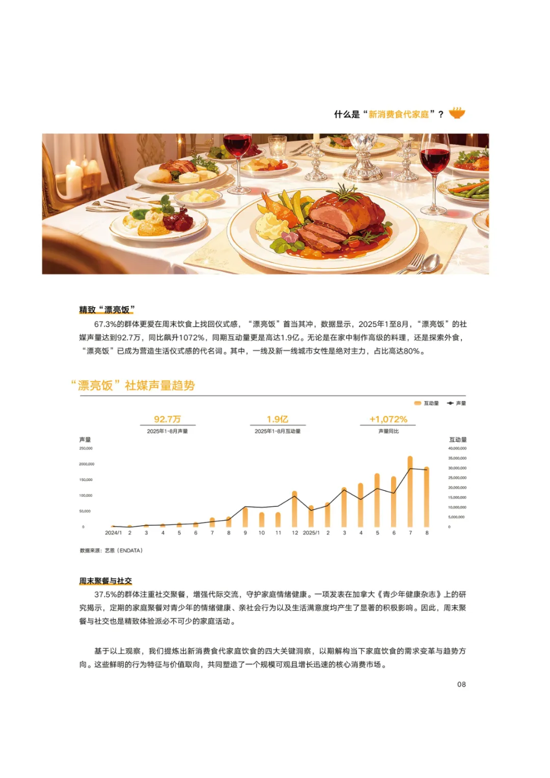 导读:报告基于 2768 份调研样本,聚焦新消费食代家庭饮食需求变革与趋势,呈现家庭饮食消费的全维度升级图景。新消费食代家庭以 80 后、90 后为核心决策群体,中高收入占比达 78.5%,覆盖一线至下沉市场。饮食需求已从单一食材升级转向 “全家适配、健康精准、效率与仪式感兼具”,分龄营养管理、成分溯源、便捷烹饪成为核心诉求。超 60% 家庭实行饮食分龄管理,82% 购买食品时优先查看配料表,近 80% 愿为可溯源成分支付溢价。效率饮食与情绪消费双线并行,半成品、智能厨具与即时零售构建 “30 分钟备餐” 生态,空气炸锅等小家电需求超 9 成。周末精致料理、户外露营饮食、家庭社交聚餐等场景化消费兴起,推动饮食成为情感传递载体。未来,技术赋能、场景细分、社交情绪价值与可持续性将成为行业核心发展方向,驱动饮食消费向多元价值共生升级。