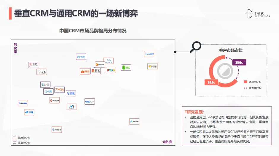 •一部分积累先发优势的通用型CRM已经开始着手打造垂直类服务,在中大型市场的竞争中垂直与通用型产品的博弈已经出现胜负手,垂直类服务开始获得优势。