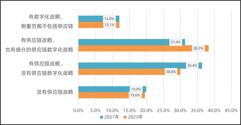 与2021年调研数据比较,有供应链战略的企业占比基本持平,但其中有细分供应链数字化战略的企业占比从31.4%提升至38.3%,如图2。制造企业已普遍认识到供应链战略对于企业发展的重要性,并且越来越意识到,供应链数字化战略成为供应链战略的重要构成部分,数字化是企业供应链韧性、可持续、高质量发展的重要支撑。伴随着环境复杂化和新兴数字技术发展,为制造企业带来供应链数字化发展的新形态、新机遇和新路径。