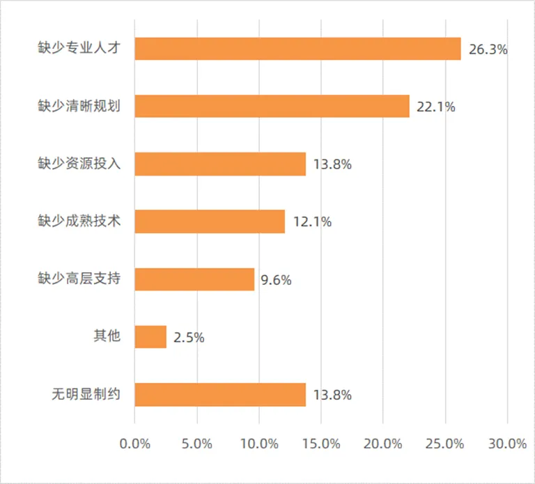 如图5所示,约50%的企业认为缺少专业人才和没有清晰的规划是最大的制约因素,同时企业缺少资源投入也是主要的数字化发展制约。