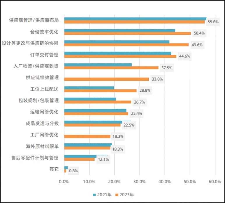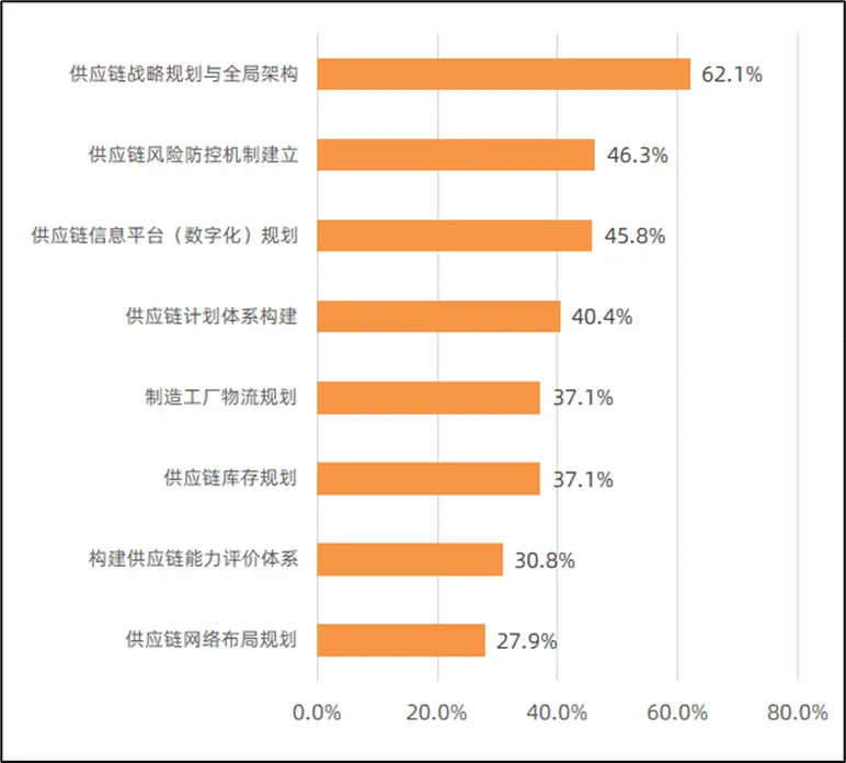 调研结论:供应商布局规划与管理、物流效率优化、设计变更(工艺、物料等)与供应链的协同、订单交付管理以及入厂物流管理等是制造企业当前供应链改善的重要关注点。