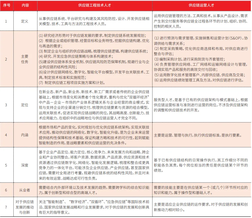 供应链工程技术人才与供应链运营人才的差异,见表1。区别于供应链运营型人才,供应链工程规划人才更加强调供应链工程技术复合能力要求,强调对供应链系统、平台进行研究、设计与构建的工程能力。供应链规划人才包括各行业的供应链、计划、物流、采购、生产、应急供应链、商品管理、供应链信息化、供应链数字化、供应链网络、供应链大数据、供应链项目、供应链技术等的规划、运营、管理、技术研究、咨询、培训、集成应用与服务等相关工程技术人员。