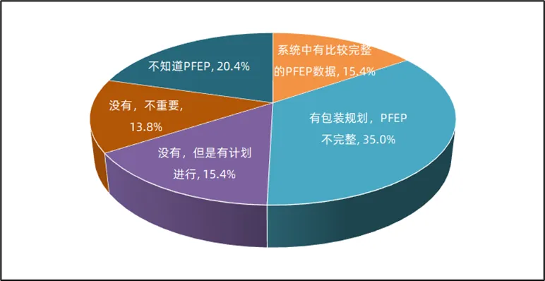 如图19所示,有50.4%的企业进行了PFEP设计和梳理,其中有15.5%认为企业有比较完整的PFEP系统数据且得到较好的应用,35%的企业进行了以包装标准化规划为主的PFEP梳理,没有或不知道PFEP的企业占比从去年的62%降到35%(如图20)。