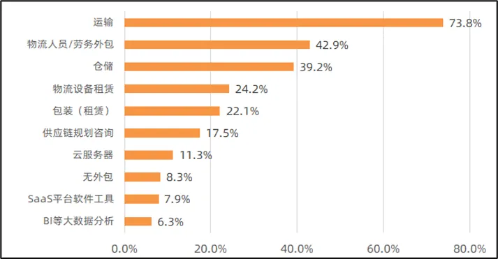 如图21、图22所示,运输、仓储、劳务外包仍是供应链服务外包的主流项目,各个服务项目外包的数据和2021、2020年也基本持平。