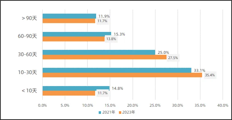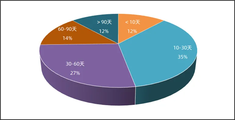 如图25所示,53%的受访企业周转天数在30天以上,库存周转水平和2021年所调研数据呈现基本一致(如图26),各企业库存周转水平保持在相对稳定的状态和水平。