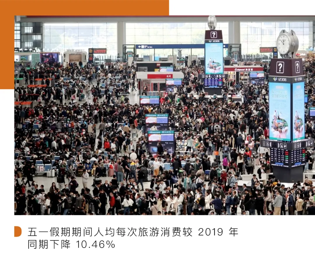 多处数字中,也不乏值得关注的个别下降指数。根据多个平台发布的五一出游报告,人均消费金额数据确实不容盲目乐观。根据文化和旅游部数据测算,今年五一假期期间人均每次旅游消费约 540 元,较 2019 年同期下降 10.46%。面对越来越精打细算的消费者,如何在高客流红利中有效实现出行消费的高质量增长与经济提振?