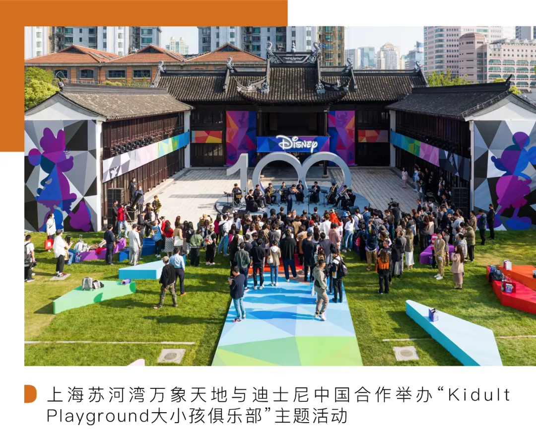 对于位于城市中心的零售业,青年社群依然是吸引年轻客群的利器。上海前滩太古里在假期前一天开启“Bond 音乐季”,聚集音乐厂牌、乐队、DJ、高校社团等,推出为期 6 天的音乐狂欢。为了击中怀有“童趣”的年轻客群,上海苏河湾万象天地与迪士尼中国合作举办“Kidult Playground大小孩俱乐部”主题活动,巨型米奇雕塑吸引“大小孩”们前来打卡,共同回顾米奇经典动画作品的发展历程、电影世界中的经典场景、以及迪士尼 100 周年系列复古画稿等。