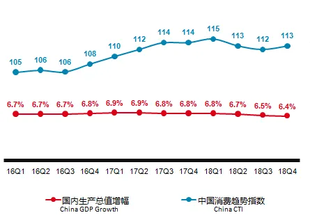 由图1可见,2016—2018年国内生产总值增幅在6.7%上下浮动,2018年下半年维持在6.4%~6.5%之间,尼尔森监测的中国消费趋势指数则在2018年第一季度达到了115,创历史新高。中国国内生产总值稳定增长给中国消费者带来强烈的消费信心。