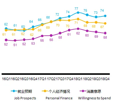 目前我国正处于中产阶级引领消费的时代,消费能力处于较高水平。国家通过全面提高货物出口退税率、给企业减税等鼓励政策以及整顿和规范市场秩序、清退合规项目等措施,为就业带来了更多机会。如图2所示,良好的就业预期是2019年整体带动消费者信心指数的主要驱动力,有望带来经济情况及消费意愿回暖,进而扩大中产阶级消费群体。