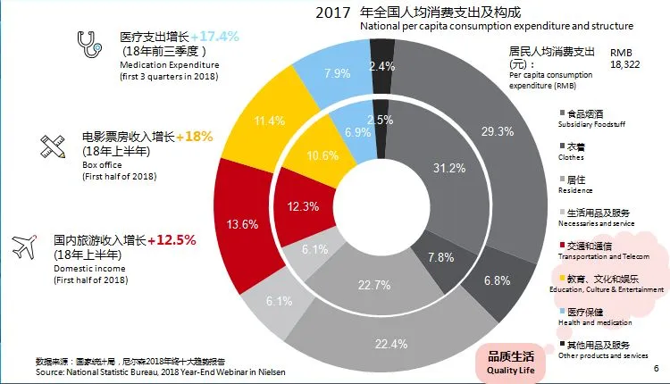 图3显示,2018年,中国消费者在医疗,电影和国内旅游这类提高生活品质消费方面呈现两位数的增长,从全国人均消费支出及构成来看,2013年交通和通信消费支出占人均消费支出的比重为12.3%,2017年比重增长为13.6%;2013年教育、文化和娱乐消费支出占人均消费支出的比重为10.6%,2017年比重增长为11.4%;2013年医疗保健消费支出占人均消费支出的比重为6.9%,2017年比重增长为7.9%。这几方面连续三年在人均消费支出的占比不断提高,均体现了人们自我关怀、自我娱乐的消费精神,是消费者追求品质生活的表现之一。