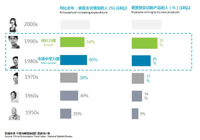 图4 2018年第二季度不同年龄段人口中家庭支出增加及愿意尝试新产品的人口占比