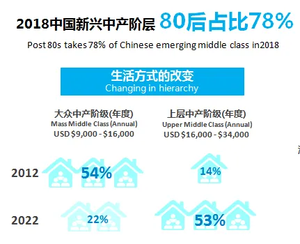 2018年中国新兴中产阶层中,80后占主导地位,占78%,是消费市场的主要贡献者。中国中产阶级,根据麦肯锡的报告来看,可以划分为两大类:大众中产阶级,家庭年收入在6万~10.6万元,这个群体2012年占城市家庭的54%;上层中产阶级,家庭年收入在10.6万~22.9万元,这个群体2012年占城市家庭的14%,其消费额占城市居民消费总额的20%。预计到2022年,上层中产阶级将占到城市家庭的53%,消费额占城市居民消费总额的56%,而大众中产阶级消费额占比约为13%。