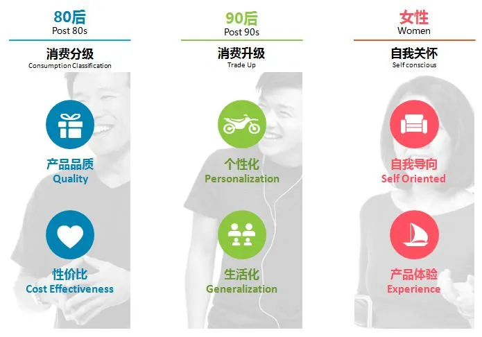 90后消费者渐渐开始踏入社会,组成家庭,消费的内容逐渐向生活必需品转移,同时追求个性和兴趣。尼尔森消费者消费意愿测试结果显示,90后消费者消费意愿表现强烈,在服装、鞋子及日用品等生活必需品、自我保养产品方面均增加支出。与此同时他们更愿意为附带个性化、明星代言这两方面产品属性的商品买单或增加消费比例,不仅涉及卫生用品,也包括其他的跨界合作产品。