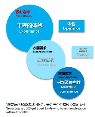据尼尔森调查显示,干爽的体验是女性消费者的核心需求,其次是保障品质及安全贴身性,材料及便利性必不可少。对卫生用品3个层次的需求表明她们更愿意在自己身上投资,注重产品体验,同时,对女性卫生用品和生活用纸的要求更高。