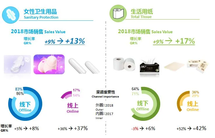 尼尔森监测结果显示,2018年女性卫生用品市场线上线下整体销售额增长率由2017年的9%提升到13%,实现了双位数增长。其中,线下销售额增长率相对较慢,为8%,而线上是市场增长的主要贡献者,为37%。2018年生活用纸市场销售额增长率由2017年的9%上升到17%,同样实现了双位数的高速增长。其中,线下销售额增长率由2017年的负增长扭转为6%,线上销售额增长率达到42%。从渠道重要性方面来看,女性卫生用品更注重可视化和便利性,女性卫生用品在线下便利店、零售店的销售需求略大于生活用纸产品。