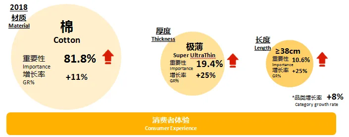 女性卫生用品消费者更加注重体验,产品的材质、厚度和长度作为产品体验的关键因素,重要性逐年提升,产品高端化发展也趋于这三个层面。2018年女性卫生用品品类平均增长率为8%,纯棉产品增长11%,极薄产品增长25%,加长产品增长25%,带动整个品类增长。纯棉、极薄、安全防侧漏等健康舒适的体验,体现了消费者的诉求。
