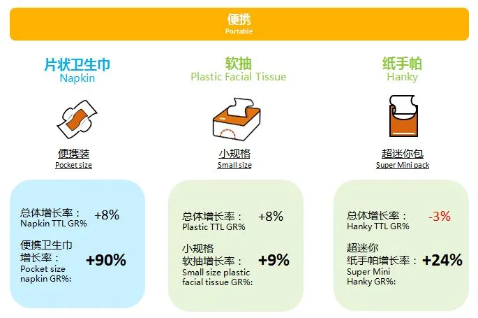 从产品规格层面分析,小规格产品占据线下市场较大份额,更受消费者青睐。便携式卫生巾、小规格软抽纸、超迷你手帕纸等规格产品发展迅速,成为市场不容忽视的一个细分。