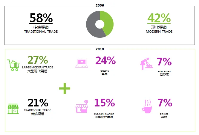 据尼尔森统计,2006年零售市场传统渠道和现代渠道各占半壁江山。经历十多年的发展,2018年传统渠道重要性降低至21%、大型现代渠道重要性降低至27%,新增电商、母婴店、小型现代渠道和其他更为专业的渠道,渠道逐渐趋向小型现代化、专业化。