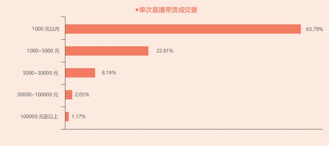 在开通直播带货的门店中,63.16%的店长表示其门店单场直播的平均观看数据是不足100人次。观看人次不足,黄金珠宝门店直播带货的收益也自然不佳。65.79%的店长表示其所在门店单次直播的平均成交额不足1000元,这与不足100人次的流量几乎完全照应。九成门店的单次直播成交额在5000元以内,只有凤毛麟角的门店成交额可以达到10000元以上。